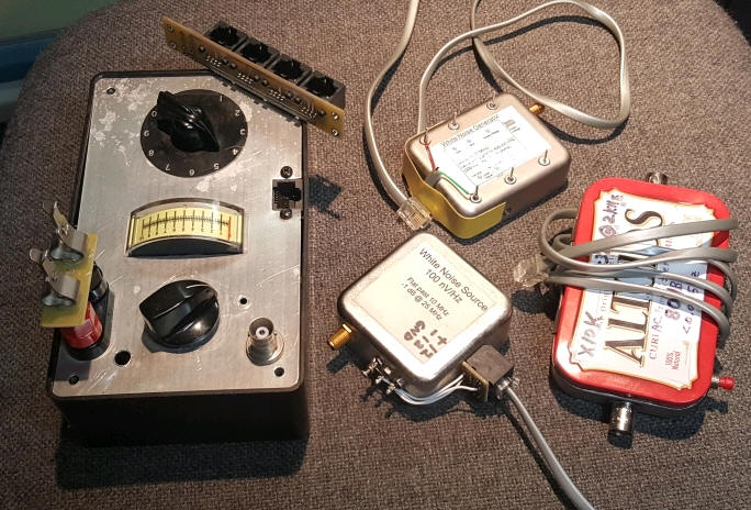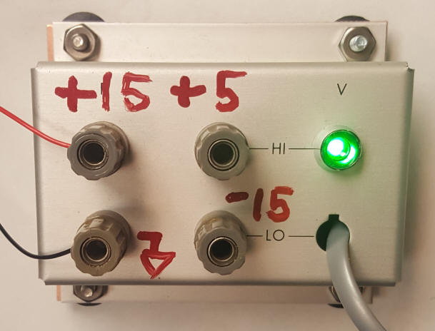 Note the big crystal tester has a built-in socket. (Nibbling from the edge makes a square hole easy!) One of the cans simply has the connector glued onto the side and the other has the wires soldered directly to the pins. Don't bother with those cheap phone cords with the copper ribbon wrapped around string; choose good cable with many strands of solid wire. The Altoids project uses +-15 volts, also with a dedicated cable. Below is a simple "outlet" box that provides remote 5-way binding post access to the three power supply voltages.