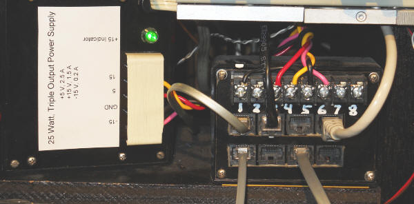 Here's one of my power "outlet boxes" tucked up under a shelf on my bench. I dragged the power supply out from the rear for the photo. Note the power supply connects via the screw terminals and one could connect additional voltages to the other screws. It's a two-way street; a signal or voltage could be coming in from your project on pin 7 and a wire could lead from that screw to a measurement instrument. Remember, every "pin 7" is hooked to every other, it's just an 8-wire bus. I've run separate wires across the room for a voltmeter only to remember I have the wire I need already in the cable!