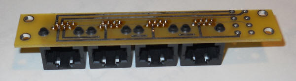 It turns out that a four wire phone connector will plug into a RJ45 jack so I chose the center two wires to supply ground and +15 volts. Single line (two wire) phone cables are thus able to supply 15 volts to your project. The second pair (pins 3 and 6) add +5 and -15 volts so a two-line (four wire) cable will give all three voltages and a ground. For more complex purposes the additional pins may be employed by using an 8-conductor network cable. I've added another ground for good measure at pin 1 and dedicated pin 2 to a variable voltage, either an adjustable power supply or just a variable voltage for tuning a varactor or other light load. (Grab a network cable and connect pins 4 and 6 across a 100k pot and connect the wiper to pin 2 - plug it in anywhere in the system and all the pin 2's have that variable voltage.) Pins 7 and 8 are left disconnected to allow for data and signals to be arbitrarily assigned as the current project requires. That brown/brown-white twisted pair (pins 7 and 8) may also carry a high-speed differential signal.