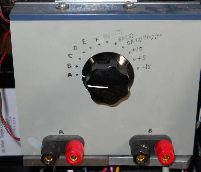 This is simply a two-pole, multi position switch, the output of which goes to my bench multimeter. The first two positions go to the two binding posts, the next four to bench supplies, the others to the +-15, +5 and variable voltage on the Popeye.