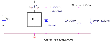 The simplest form of switching regulator is the buck regulator. Look at the figure below and imagine that the switch has been closed for a very long time. Under these conditions, Vload will be equal to Vin. Therefore, this type of regulator can only produce an output voltage that is less than (or equal to) the input voltage. Now imagine the switch has been open for a long time. Vload will equal zero. These are the boundary conditions for this design.