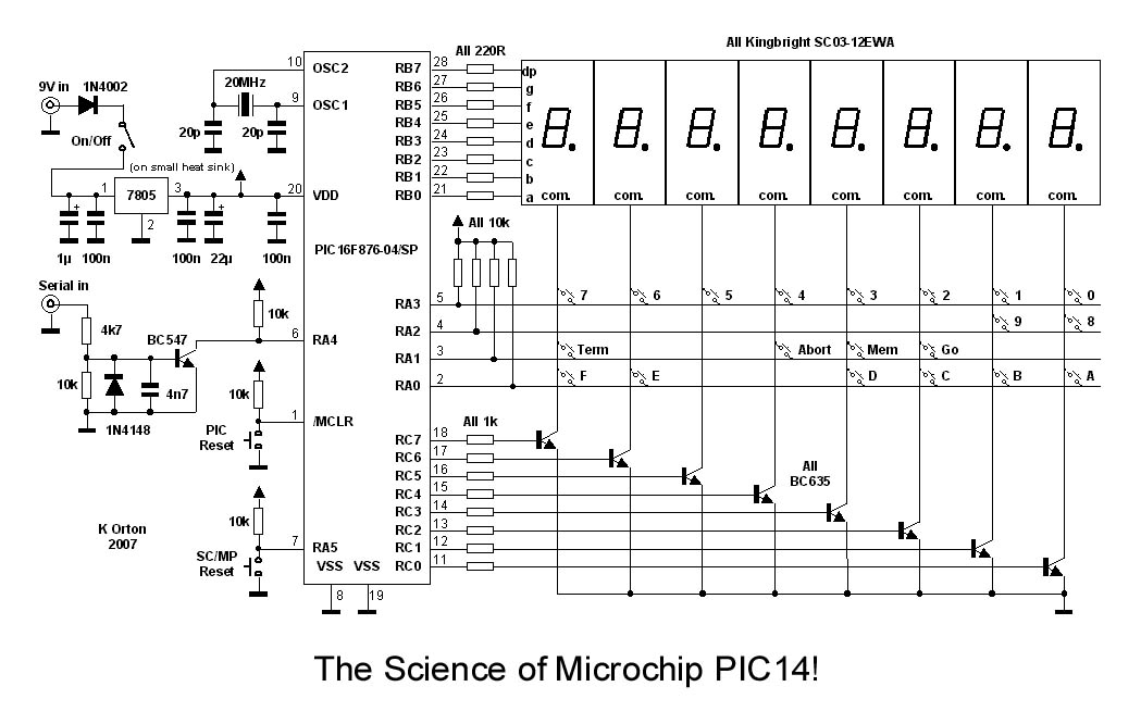 The PIC14 program will run in a PIC16F876, Ports A, B and C providing an interface to the display and keyboard. If the PIC14 program is run in a PIC16F877, then the SC/MP flags can be accessed on the additional Port D and Port E pins. The author is confident that these processor flags and sense lines work, though they have only been tested in simulation, and even then not very thoroughly!