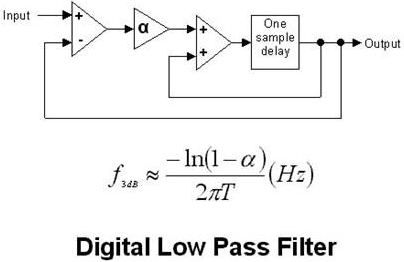 Fortunately, there are tricks we can use to avoid multiplication completely, provided we compromise on the precise responses of our filters. For instance, the simple first order low pass filter (traditionally implemented as a capacitor and a resistor) is made digitally using a delay element and feedback as shown in the following diagram. In this diagram the gain element α is in the range 0..1 and the time between samples is denoted by T.