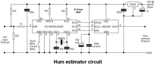 This project is a portable (i.e. PC-less) hum rejecter (or more accurately, hum estimator) principally for VLF listening application. It employs the PIC’s ADC to sample the hum waveform, and performs a special type of filtering to isolate it. The hum waveform is then reproduced on an external DAC so that it can be subtracted from the VLF signal.