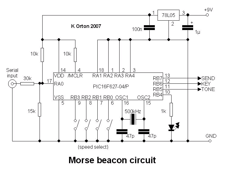 The rate at which the message is keyed can be set on a bank of four switches attached to the RB0..RB3 inputs of the PIC. The four bit code on these switches sets the speed in the range 5..20 ‘Paris’ standard (the case of all switches ‘off’ selecting the slowest speed).