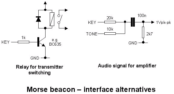 There are a number of interfacing options for the beacon, outlines for which are provided. A 700Hz square wave is present on the TONE output during keying and this can be combined with the KEY output in the proportions 2:1 to produce an audio signal whose DC level doesn’t shift with keying. This helps to reduce the keying ‘thud’ that would otherwise be heard.