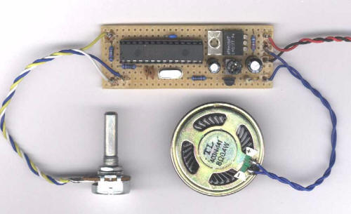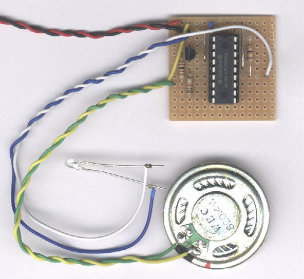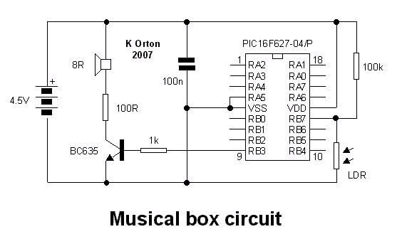 This little novelty uses the PIC PWM output to produce an approximation to decaying sine waves, which sound very much better than fixed amplitude square waves, but its still far from precision function generation!! An LDR provides a simple way to detect when the lid of the music box is opened. Alternatively of course, pin 13 (RB7) can be tied low and a microswitch employed on the power rail.