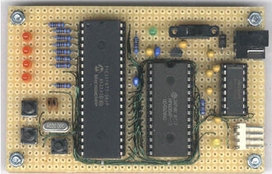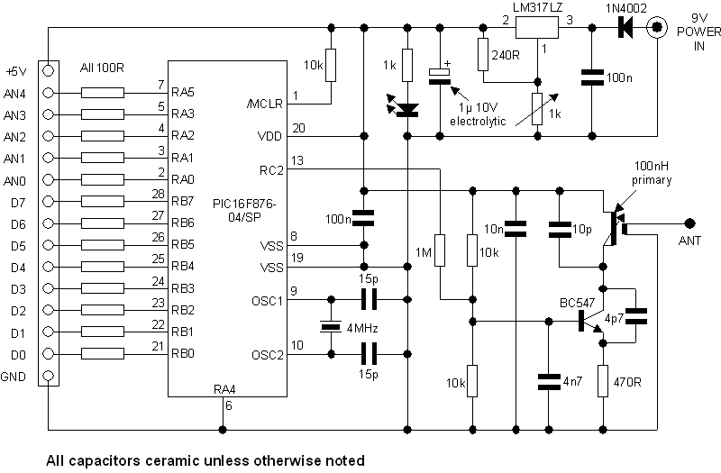 Finally, the PIC can be clocked from either a 4MHz crystal or a 4MHz ceramic resonator. In the latter case the 15pF capacitors may need to be raised in value to as high as 68pF.