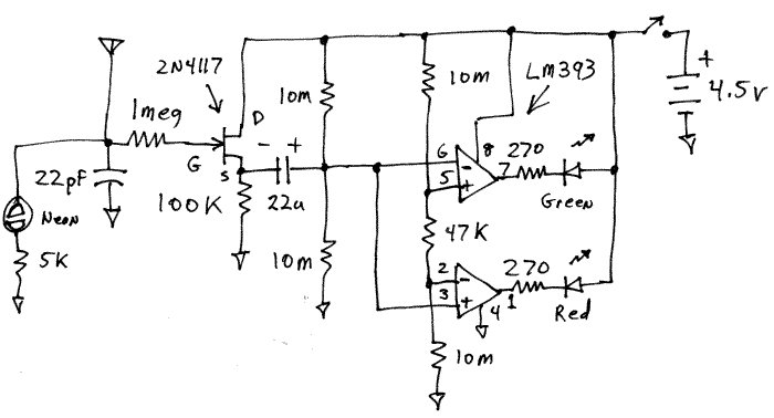 Here's how it works: The electrometer JFET buffers the voltage on the telescoping antenna. Its gate is gently biased low by a neon lamp that contains a little thorium that makes it slightly conductive (most, if not all, neons have thorium inside to help them start). The 22 pF is optional and reduces the 60 Hz "hum" level a bit. Much bigger and the response to sudden changes starts to be impaired. The 1 megohm in the gate is there to protect the JFET from static discharge when the antenna is touched to something. The FET configuration is called a "voltage follower" and the source of the JFET follows the gate fairly closely with a positive offset of a volt or two. That voltage is coupled through the 22 uF and biased up to 2.25 volts by two 10 megohm resistors. That voltage is applied to two comparators, to the positive input of one and the negative input of the other. The other inputs of the comparators are biased to have a slight offset produced by to the 47k resistor. The 47k resistor determines the width of the detection "window." The voltage from the capacitor must exceed the additional voltage produced by the 47k to light either LED. Most homes are literally awash in 60 Hz "hum" from the wiring and both LEDs will light since the voltage easily exceeds the window "width." Increasing the 47k can prevent that behavior but also decrease the sensitivity. In my chicken wire enclosed garden (basically a Faraday shield) only the green LED glows, probably due to slight offsets. In the garden I can pull the antenna all the way out and I can detect my pocket comb dragged through my hair (to charge it) from several yards away. Wiggling it back and forth causes each LED to light brightly. It's pretty sensitive! In the house both LEDs glow but I can still detect a charged comb for quite a distance by observing variations in the brightness of the LEDs.