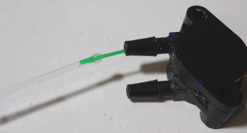 To get the air out of the transducer's pressure side I made a special tool from a glass pipette and a length of insulation from phone (or network) cable: