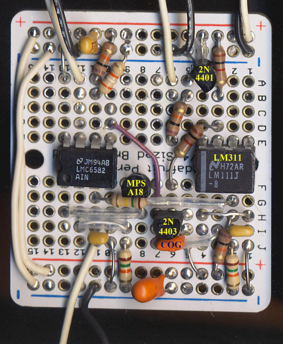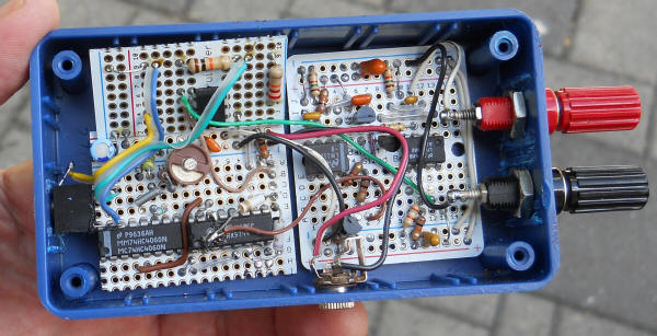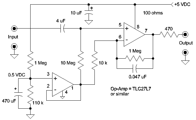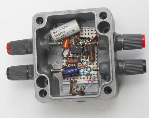 Note: On mine I've lowered the 1 megohm from pin 6 to pin 7 to 470k for a gain near 48.