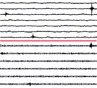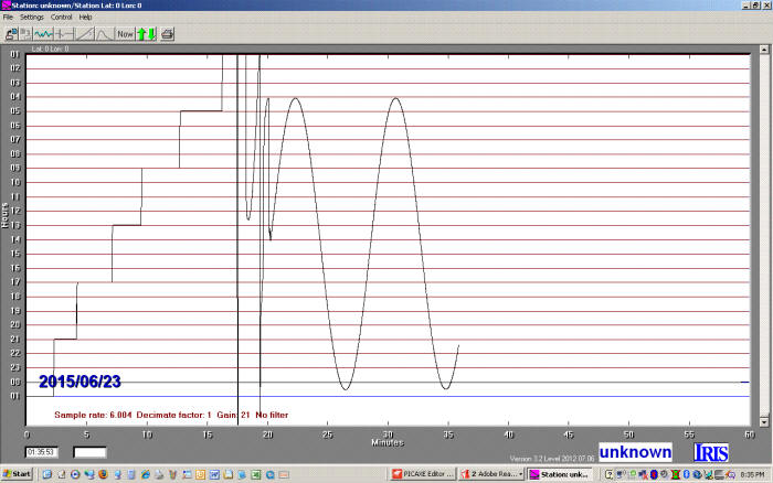 The following images surprise me. The top image is the water-hammer seismometer and the one below is a "real" seismometer at the University of Texas. Mine is obviously horizontal sensing and theirs is vertical so they're not expected to perform the same but I never expected to be able to see tiny quakes better with mine! The difference is even more pronounced if I turn up the gain on mine to equal their background noise.