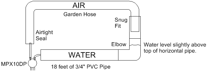 The diagram above illustrates the simple apparatus. Lay the water pipe on a flat and very level surface away from wind and weather, perhaps a basement floor or crawl space. It needs to be in intimate contact with the earth or structure movements will overwhelm the system. It should be reasonably level, too. The far end of the pipe has an elbow and a foot of vertical pipe. I leaned mine against the concrete wall to keep it vertical but a couple of cinder blocks would also work. The working end of the pipe is sealed except for a short length of flexible tubing that fits snugly over the nipple of the MPX10DP pressure sensor. I simply drilled an appropriate hole in a PVC end cap and glued the tubing in place with "Plumber's Goop." It's important to get all the air out of the pipe so pinch the tubing closed with a spring clip, lift the far end of the pipe a foot or two off the ground, and fill the pipe with water (including the vertical section). After a while all the air will work its way out of the tube. Shaking it and tapping on it can't hurt. The flexible tube will attach to the MPX10DP port near pin 4 (pin 1 has a notch) but it's important to get the air out of that port and the flexible tubing, too.
