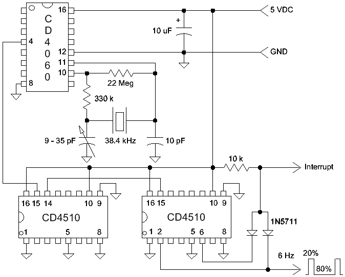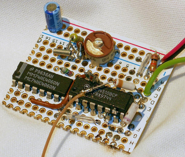 Note that I stacked the '4510s since they share so many common pin connections. I also connected the unused programming pins but those could just as well be cut short. The "6 Hz" output above connects to the "Stop" input below.