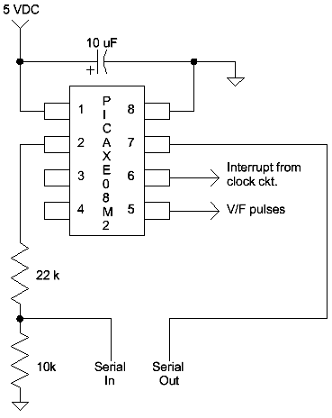 The PicAXE attempts to count pulses for 150 mS (1200 mS * 4 MHz/32 MHz) but while it's counting the V/F is stopped by the clock circuit at 133 mS. This gives the crystal-controlled clock circuit control over how long the PicAXE counts. (Setting the PicAXE count window to 150 milliseconds insures that the counting continues past the point where the V/F is stopped so as to not miss any pulses.) About 17 mS after the V/F is stopped an interrupt pulse is generated. When the interrupt occurs the count value is sent to the computer and the count is reset. This happens quickly, before the next clock cycle begins. The "pause" in the program is a "waiting place" where action stops until an interrupt happens. I'm taking advantage of the fact that an interrupt sets such pauses to their end after the interrupt; the pause is forced to be done and the program immediately starts a new count.