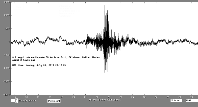 Here's another recorded 10/10/2015 from a small 4.4 magnitide quake in Oklahoma (same one as on the multi-trace image above). The inset shows how it looked relative to the other traces. The plot to the right is from a "real" seismometer located at the University of Texas. The water hammer seismometer isn't nearly as sensitive but it can see pretty small quakes. I think the U.T. seismometer is a vertical sensor and mine is horizontal and "pointing" east and west, not that it seems to matter much. It's pretty exciting to see a distant weak earthquake with a tube of water. : )