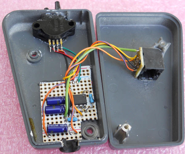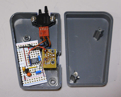 The version above uses the INA217 amplifier from Texas Instruments. There's a 100 ohm gain resistor and a 75 ohm resistor in series with the output - that's about it. I put 100 uF capacitors across +-15 VDC and +5 VDC. The amplifier is powered by the +- 15 volts and the transducer by the +5 volts. I use network connectors and cables to distribute power and signals, hence the black RJ45 jack. I put it inside with a grommet to seal the cable since I had a corrosion issue with the previous design. In retrospect it would have been better to solder in a cable and put the connector at the far end of the cable near the second amplifier (away from all the water). Note that I didn't put any inductor or resistor in series with the 5 volt supply to clean it up; the V/F is ratiometric and it's desirable that it "see" the same noise as the transducer. The ratiometric cancellation is in excess of 40 dB but only if both the V/F and pressure sensor are running off the same voltage. My first version used the AMP04 which is also an excellent choice. It runs on a single 5 volt supply and has provisions for adding a filter capacitor: