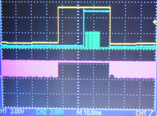 Here's the simple 6 Hz clock that will turn the V/F on for 80% of the cycle, about 133 mS (active low - yellow trace above). This 6 Hz signal is tied to the "stop" input of the V/F halting the converter when that line goes high. About 17 mS later, the interrupt line goes high, causing the PicAXE to send the pulse count out the serial port and then to reset the count. That all happens before the next counting cycle when the 6 Hz line drops low again. I avoided using another IC by using two diodes to perform an AND function. You will note that I actually used germanium diodes. : ) Ordinary silicon diodes should work fine but schottky diodes will give a lower voltage low logic level, not that it's needed.