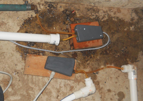 I stripped the green insulation off the solid copper wire but this time I was after the insulation. I glued the resulting tiny green tubing into the end of a chemistry pipette. There's any number of ways to do it; you just need a thin tube to get the water deep into the sensor's chamber. Holding the sensor vertical (not horizontal as in the photo) flood the chamber with water making sure the insulation tubing is near the bottom of the chamber. Keep squirting in water as you remove the tubing. There should be no air inside when you're done. Do this as a last step, right before you connect the flexible tubing. Remove the clip from the end of the flexible tubing and let a little water squirt out to remove any air. Now, the tricky part: Holding the transducer vertical bring the tubing down from above and let water squirt out as you mate the two. You should be able to feel confident that there's no air trapped inside. It's not really all that hard but I had to start from scratch a couple of times. Plus, you're probably doing this in a dark crawlspace. And another thing, once you get the tubing on the sensor in a satisfactory way glue it in position with Goop or a similar fast-setting glue our use thin cable ties behind the taper. I can't tell you how frustrating it is to get it just right only to accidentally pull it off with your foot when you try to leave. I mounted my sensor in a thick plastic case with only the two nipples sticking out and that prevented me from using thin cable ties to secure the tubes because I couldn't get to the back side of the taper. Cable ties just squeeze the tubing off the nipples in my arrangement. So you might cut a bigger hole such that more of the sensor sticks out. You can see that water will be splashing around so it's a good idea to mount the sensor in a plastic box and seal it with Plumbers Goop to keep the electronics dry. The other nipple connects to tubing that interfaces to an air-filled pipe of some sort; I used an old garden hose. This hose goes back to the far end and nearly closes the system. Next remove the excess water from the vertical section of the pipe. I held a length of clear tubing up next to the vertical section measuring how far to insert it to be just a little above the elbow, stuck it into the tube, and sucked out the excess water. The clearness of the tube allows me to stop sucking before I get a mouthful. : ) Add a splash of bleach and stick several inches of the garden hose into the vertical section. Don't make it an airtight seal so that the air pressure equalizes slowly, bleeding around the garden hose. My second garden hose didn't fit easily into the pipe so I literally sanded it thin with coarse sandpaper; those white with blue stripe hoses for RVs fit nicely.