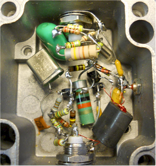 The experimenter might want to increase the emitter resistor from 15 ohms to soften the oscillation. Too big, and it will stop. Just right, and there will be less harmonic bleed-through. Not shown in the schematic is a 220 pF capacitor that I added to mine across the output connector to kill some of the higher frequency harmonics from the crystal oscillator. They weren't really causing a problem, but the capacitor reduces them on the 'scope without hurting the gain. | |