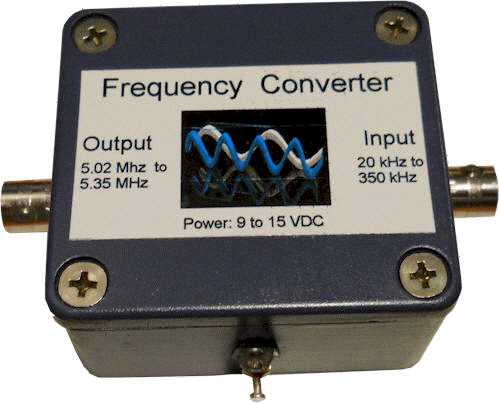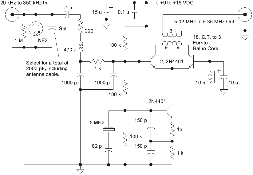 This converter shifts the VLF/LF bands, from below 20 kHz to over 350 kHz to the shortwave frequencies, determined by the selected crystal. In this prototype, the crystal frequency is 5 MHz, so the LF band comes out at 5.02 MHZ to 5.35 MHz, suitable for use with a shortwave receiver. Notice the lack of an expensive mixer or special IC!