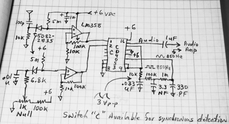 In my version, the analog switch toggles between the DC from the detector diode and a reference diode. To the extent that the reference diode tracks the detector diode (mostly thermally) this should produce about the same result as turning the RF on and off to the detector diode. (In other words, when the RF is off, both diodes should produce the same voltage.) I don't "touch" the RF before the detector and I can null out a steady background RF level. The oscillation can be stopped by grounding pin 11 of the CD4053 with a toggle switch and the circuit will then behave like original All Band Receiver. The details of the audio amplifier haven't been worked out but a simple LM386 is probably sufficient. I might use an op-amp stage of some sort as a preamplifier if I want to synchronously detect the signal for driving a meter (using switch "C").