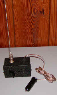the numerous strange sounds. By trying different antennas and locations, this receiver has picked up AM radio stations, FM stations, TV video (buzz), car lock transmitters, cell phones, and even the microwave oven (a whoosh-whoosh sound as the microwave spreader rotated). It isn't clear how FM stations are demodulated; perhaps the antenna Q is sufficient for slope detection. (See reader Karen's excellent theory.) Even the familiar buzz from a narrow-band FM pager transmitter has been heard - somehow. There are some mysterious signals out there, too! What is that occasional descending whistle over by the highway? Some vehicles emit a curious buzz, too. If you hear a mysterious click-click now and then, its your cell phone! Don't expect to tune in international shortwave stations. This receiver is for strong, local sources. The advanced experimenter will find it useful as a detector section for low power tuned receivers. Karen recorded the sound of a U.K. cell phone tower! |