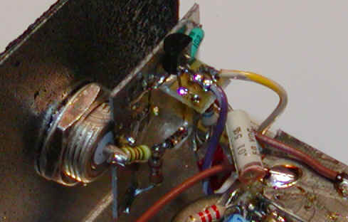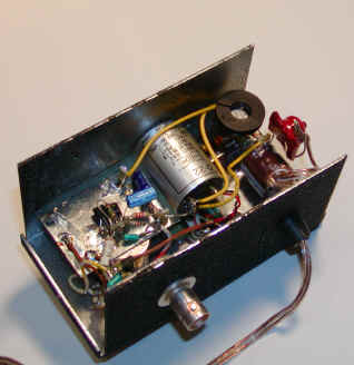 The audio transformer is the metal can in the picture above but any 500 ohm to 8 ohm miniature type will work. The output transistor has a black heat sink attached and is mounted to a miniature terminal strip. The red blob is one of the power chokes before it is secured to the capacitor with some hot-melt glue. Notice that the circuit is separated into three sections to reduce feedback. The output stage is directly connected to the incoming power leads, and the rest of the circuit has a filter consisting of a 100 ohm resistor and 22uF capacitor to reduce the possibility of feedback via the power supply. The diode detector and first transistor are mounted directly on the BNC: