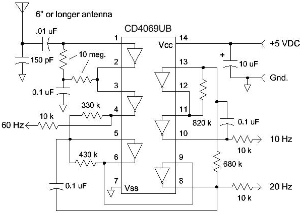 Like the Two-Transistor Atomic Frequency Standard, the CD4069 Atomic Frequency Standard picks up AC "hum" from the surrounding environment to produce an accurate frequency reference. This simple circuit generates 10 Hz and 20 Hz from 60 Hz power grids. It's just for fun but I actually use mine all the time!