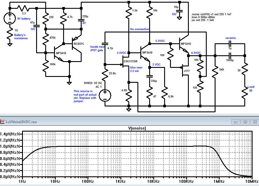 The Curiously Low Noise Amplifier takes advantage of the wonderful noise characteristics of the 2SK117 JFET that boasts a noise voltage below 1 nV/root-Hz and virtually no noise current. The noise voltage of the amplifier is only 1.4 nV/root-Hz at 1 kHz, increasing to only 2.7 nV/root-Hz at 10 Hz. The noise current is difficult to measure, so this simple utility amplifier can see the noise from a 50 ohm resistor and a 100k resistor, too. (The 1.4 nV input-referred noise will increase to about 1.7 nV with a 50 ohm resistor, instead of a short, and a 100k resistor will give an input-referred noise near 40 nV, with very little contribution from the amplifier.)