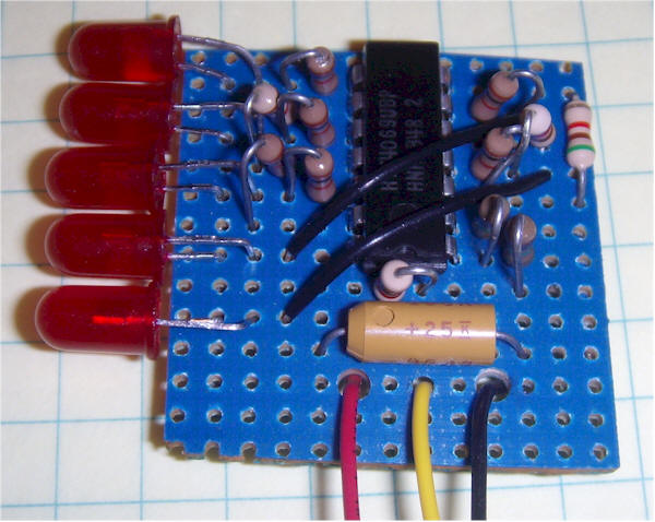 View a short Flash video to see the smooth transitions between LEDs. The transitions are even smoother than the video shows. The camera saturates a bit at full brightness, but the eye can still see the bright LED intensifying as the next LED begins to glow. The circuit will work at other voltages, but the LED resistor values may need to be adjusted proportionately.