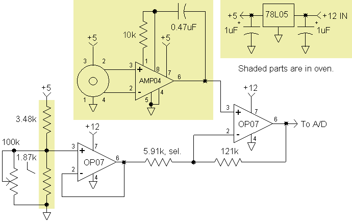 In the schematic above, the shaded parts are inside the oven. In my prototype the offset and gain are set such that the circuit outputs precisely 3 volts at 30" with a 1 volt per inch sensitivity. The two ovenized resistors (3.48k and 1.87k) were chosen to give a slightly low zero offset so that the 100k potentiometer would bring the zero to the desired spot when set near 50k. Since the 50k pot resistance is large compared to the divider resistors, the pot's temperature coefficient has little detrimental effect. The gain resistors (5.91k and 121k) were experimentally chosen to get the desired sensitivity. Such care in adjusting the offset and gain is not necessary since the offset and gain may be corrected in the qbasic software or even on the spreadsheet. But the offset must be set to move the output to the middle of the op-amp's range and the gain must be sufficiently high to get good resolution but not so high that the circuit runs out of voltage swing at the extremes of pressure.