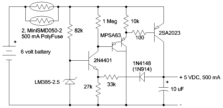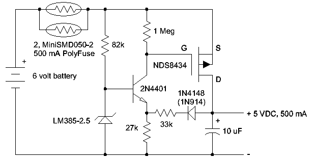 Vary either the 33k or 27k if the voltage isn't near 5 volts. The circuit should hold the voltage within about 50 mV of 5 volts for no load to full load over normal temperature variations. The circuit draws about 175 uA and that's less than the self-discharge of the NiCAD battery pack so no power switch is needed. You can also reverse the polarity of everything and use an N-channel mosfet. Remember, many mosfets require too much gate voltage to turn on - look for one with a Vth below 2 volts. the NDS8434 threshold is typically 1.5 volts. My N-channel version couldn't supply the full 500 mA because the circuit couldn't quite pull the gate voltage high enough.
