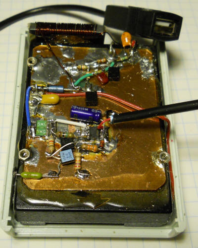 Don't copy my assembly technique! First of all, I had to cut all the mounting posts out of the case to get the battery to fit and it is held in by glue. Notice the silver nuts soldered onto the PCB for securing the cover! Secondly, there is very little height for the circuitry so everything is pressed down flat against a piece of copper clad board using little bits of board for the connections. That's a fine technique but this prototype was just too tight for comfort. Third, I had to search a while to find an inductor that would fit!