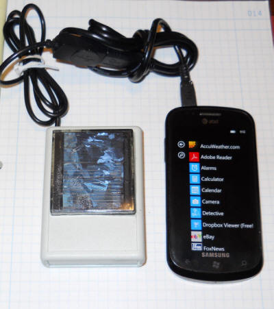 USB Pinout: Search the web for a pinout image. The power is on the outer pins but if you cut a USB extension cable in half the way I did (using the female end for the project), you might discover that the wires are properly color-coded with red (or orange) being plus and black (or blue) being minus. Looking into the end of the connector with the conductors facing down, the pin on the right is +5 and the pin on the left is ground. Boy, it's easy to get confused! You can plug the candidate connector or cable into a computer using another USB cable and verify the voltage with a meter - highly recommended!