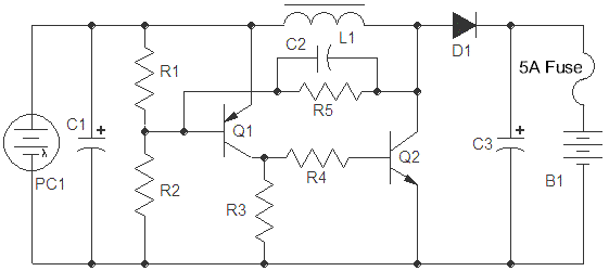 Note: This circuit is intended for using a low voltage cell to charge a higher voltage battery. Don't use it to charge a battery at the same or lower voltage than the cells generate. The circuit needs a battery load to work properly. Make sure to use a NiCAD battery as they are tolerant of overcharging. Leave the unit in a sunny place and the battery should stay good for years.