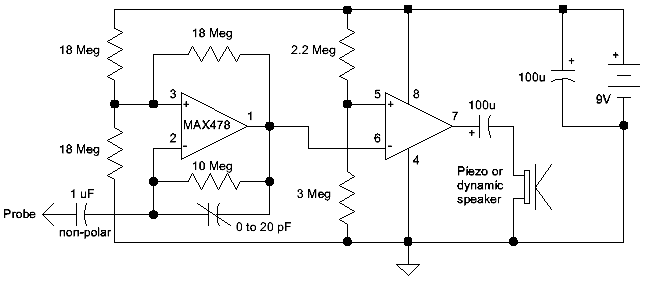 The MAX478 is obsolete so choose a very low current op-amp as a substitute; The TLC27L2 looks like a good candidate. Make sure the op-amp can operate on 9 volts. If you don't choose a micro-power op-amp you will need to add a power switch. The prototype draws about 25 uA when not "beeping" so the battery should last a couple of years. |
