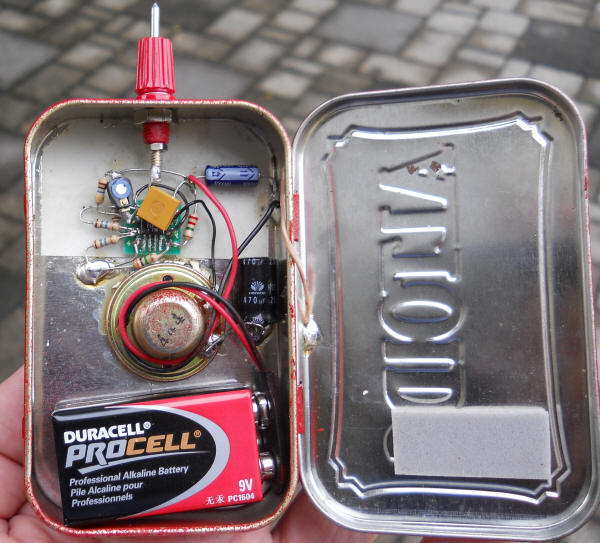 I built this version into an Altoids mint tin also. I decided to paint the tin but that insulates the metal. If you do the same, scrape the paint off the rolled lip of the lid such that the fingers make direct contact with the metal when holding the tin. Note the wire that connects the lid to the case. Construction isn't particularly critical but keep the probe wiring short. The capacitor goes directly from the probe to pin 2 of the op-amp.