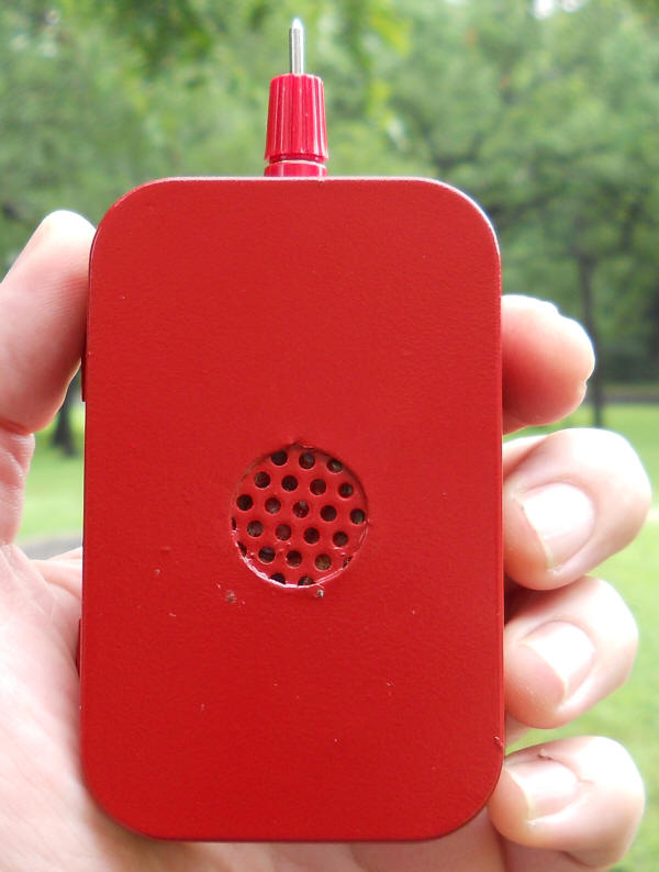 The probe should be built into a metal box so that one hand makes good contact to the circuit ground. My beeper is built into an Altoids Mint box with the paint sanded off (use steel wool). Leave the paint if you like the artwork! I prefer the scientific motif. The open beeper is shown below. The thin metal box is easily soldered so all ground connections are directly soldered to the box. Also note the strip of PCB material soldered into place next to the battery to form a simple battery holder. A strip of foam pushes on the battery when the lid is closed. There is a single small hole for the sound under the speaker.