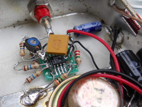 My version relies on the low output current capability of the MAX478 (about 7 mA) to limit current into a 30 ohm headphone speaker. If your micro-power op-amp can supply significantly more current, add a resistor in series, say 100 ohms. Or use a piezo type speaker. Those little "beepers" on computer boards also work well (the ones without a built-in oscillator). The 100 uF in the output is "overkill" and a 10 uF should work for most speakers. I actually used 470 uF simply because it was laying on the bench. Piezo speakers don't need a cap at all. | |