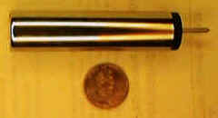 Below is a fancy version built into a round nickel-plated can using a miniature 7.5 volt battery and a small electro-magnetic transducer from an old processor card (the "beeper" speaker). The left end of the probe has a small hole for the sound and the probe end has a tight-fitting grommet with a probe tip in the center hole. A ground connection is made internally.