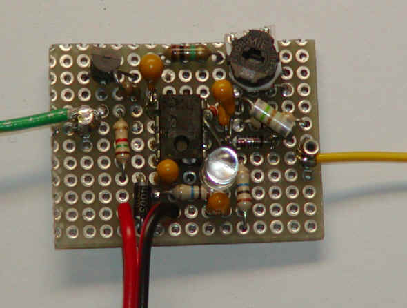 The 1N4003 between the power leads is an optional "idiot diode" connected in series with the power to prevent damage in the event the power connections are reversed. The wiring is not critical except for the first diode and the .1uH choke (.15 uH in the prototype) which should have short leads. The 2N4401 can handle several hundred mA loads but a power darlington or mosfet transistor could be substituted (see first schematic above).
