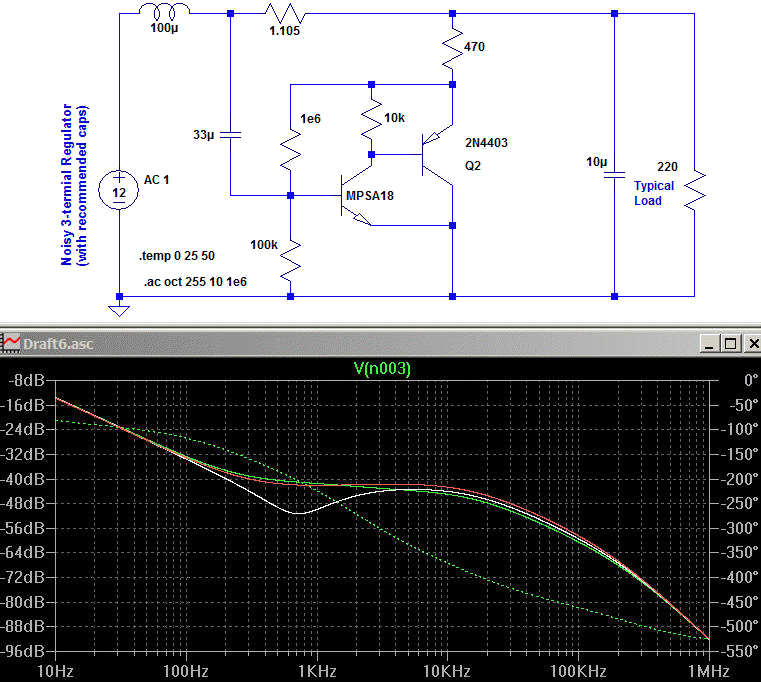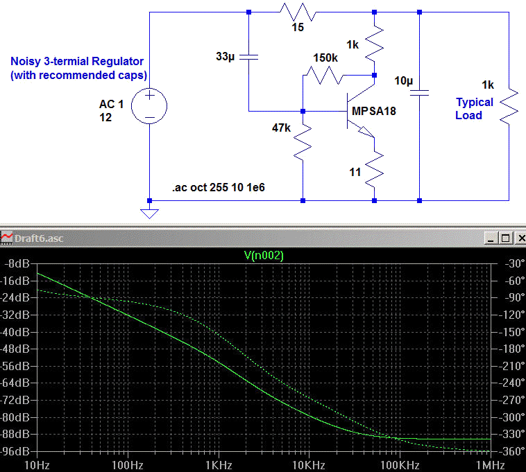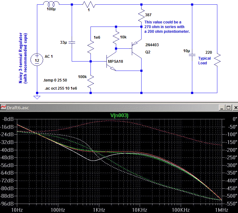 Consider the low power version shown below which might be suitable for cleaning up the supply to a low current device. A 15 ohm resistor is inserted in series with the regulator's output giving a 300 millivolt drop when the load draws 12 mA - typical for a low-noise preamplifier or oscillator circuit. The single transistor amplifier has an emitter resistor which combines with the emitter diode's resistance to give a value near 15 ohms. The regulator's noise voltage appears across this resistance so the noise current is shunted to ground through the transistor's collector. The noise reduction can be over 20dB without trimming the resistor values and the intrinsic noise of the MPSA18 is only a few nanovolt per root-hertz. Trimming the emitter resistor can achieve noise reduction greater than 40 dB as seen in the simulation where 11 ohms is about perfect.