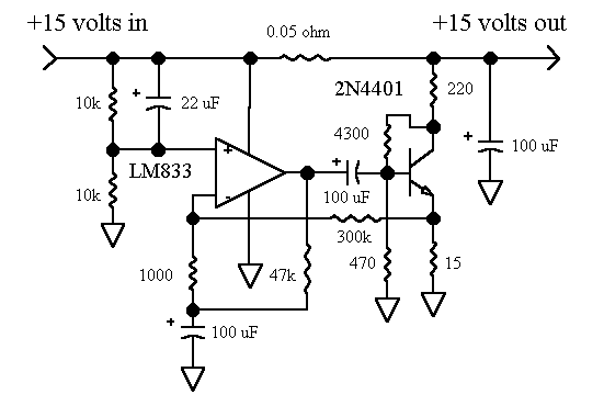 Op-amps will allow much lower series resistance. The following circuit is designed for filtering 15 volt supplies like those typically found in instrumentation. The shunt will greatly reduce white noise, spurious signals, and line-related signals on the power supply; the attenuation can exceed 40 dB with careful construction. The values are not critical except that the gain of the amplifier should be very near the ratio of the transistor emitter resistor to the series shunt resistor. In this case the gain is 15/0.05 = 300. Actually the gain is 301 with the indicated values so a 299k resistor would be theoretically better but the resistor tolerances and the actual resistance in the 0.05 ohm shunt path will cause more variation. One of the gain resistors may be made variable to allow the performance to be tweaked for the deepest null, if desired. Choose a low noise metal foil or wirewound potentiometer for best results. Standard fixed values will give excellent noise reduction sufficient for most applications. The LM833 is an excellent choice but many other low noise op-amps will work well. Choose an op-amp with a high bandwidth and low input noise voltage. A higher value shunt resistor may be used if the voltage drop can be tolerated; adjust the gain of the amplifier to match as described above. The LM833 is a dual op-amp so two shunts may be implemented with the one package for filtering two different supplies or for cascading two shunts for additional line rejection and noise reduction. The noise shunt provides no load rejection beyond the rejection provided by the source regulator through the 0.05 ohm resistor.