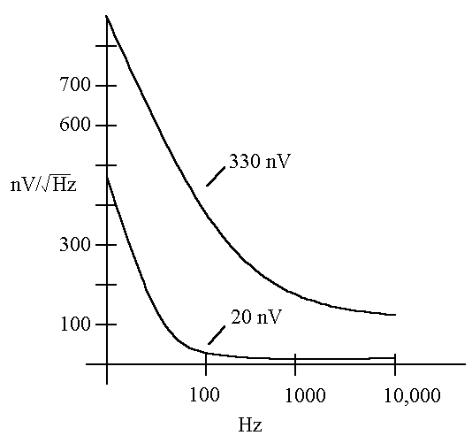 The following graph shows the performance of the noise shunt when powered by a three-terminal regulator. The regulator's noise is 330 nV per root-hertz at 100 hertz and the circuit reduces this noise to 20 nV. This 24 dB reduction is achieved without any selected values and with no particular attention paid to the layout. The one potential problem area is the grounding; heavy ground traces or even ground plane are recommended. The ultimate rejection of the circuit is better than the apparent rejection in the plot; low frequency performance is impacted by the size of the coupling capacitors and the noise floor is limited by the performance of the LM833 and resistor noise.