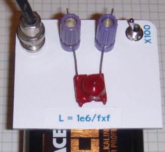 The Large Inductor Quick Tester is basically an LC oscillator that makes determining the value of large inductors quick and easy. In the spirit of "Battery Toppers", the circuit requires no power switch and may be mounted directly on top of a lantern battery which provides a nice, heavy base.