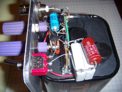 The circuit is built right on top of a lantern battery. Most of the parts are mounted on a terminal strip that is glued to the top of the battery using ordinary contact cement. I 'decanted' contact cement into little squeeze bottles from an economically priced large can and added a little MEK solvent to make it a bit more runny. Just apply a bead to the bottom of the strip, position it so that glue transfers, remove it and let the glue dry a couple of minutes. Then very carefully press the strip into position; you only get one chance to get it right! Contact cement is really fast, plenty strong, and not that difficult to remove when the battery finally dies. The panel is also held by the same glue.