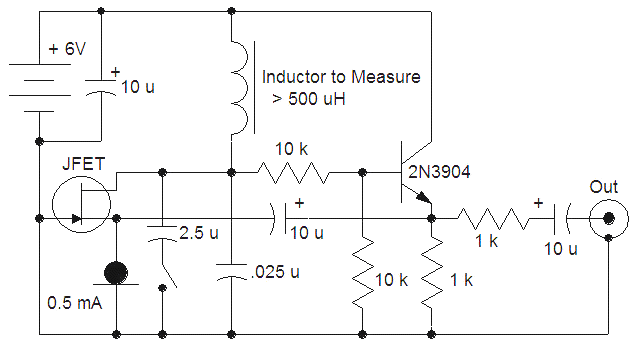 The JFET may be just about any type; the prototype uses a J212. The current diode is a nice way to bias a JFET but they aren't common and a couple of thousand ohm resistor will also work. Measure the voltage across the resistor and select a value that gives about 1 mA. Choose a different FET if you can't get at least 1/2 mA with at least 1k of resistance. If the resistance is too low, the tendency to oscillate will be reduced. Other components aren't critical at all. The .025 uF and 2.5 uF capacitor were selected to make the inductance calculation simple and the values were realized by paralleling standard value film types. The inductance is simply 1,000,000 / (freq squared) for the .025 uF (up to about 1 Hy) and 10,000 / (freq. squared) for the 2.5 uF. Simply hook the output to a frequency counter and measure the frequency with the inductor connected. No current flows without an inductor so no power switch is needed. But, don't forget to remove the inductor! You might wish to install an LED between the plus of the battery and the 10 uF bypass capacitor to let you know when it's drawing power.
