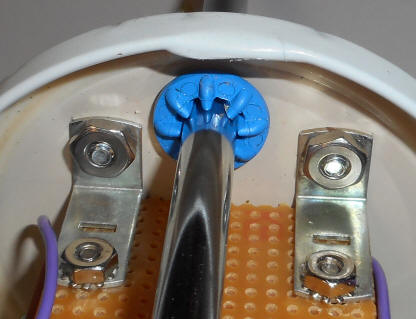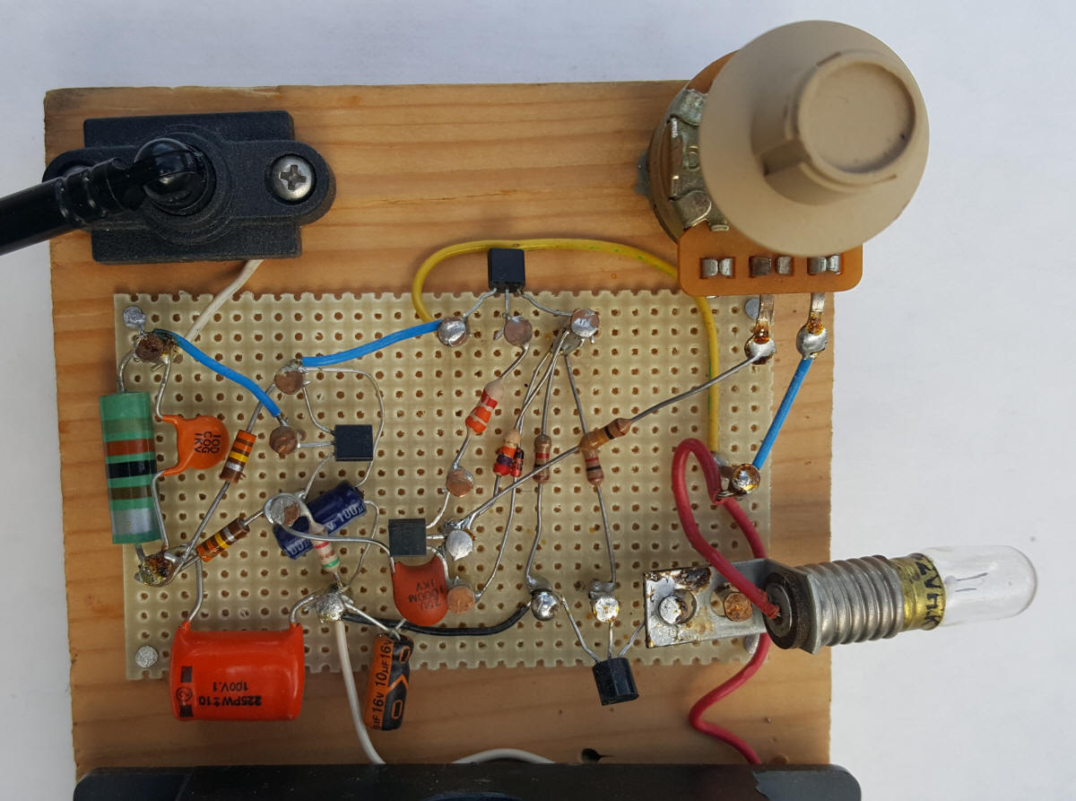 Below is a close-up with the sensitivity adjustment option and an incandescent bulb. The construction technique was chosen to make it easy to follow the wiring. Normally, the leads would be stuck through the holes and wired on the other side of the perf board. I used the perf board simply as a guide for copper nails driven into a pine board - strictly to make it easy to see all the connections. The perf board serves no purpose beyond visibility, so one could also use nails and wood for the assembly. The copper nails from the home improvement store really solder easily, by the way.
