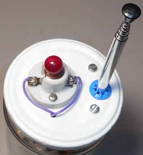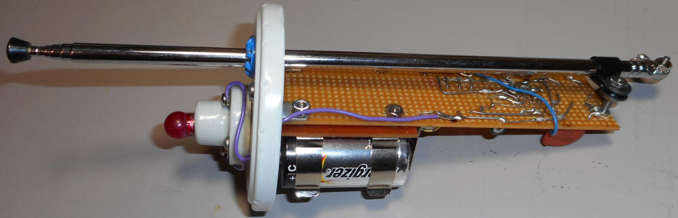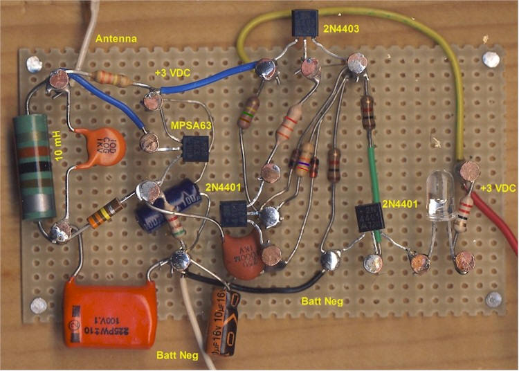 Here's a version I built into a "fake" book I found at an art store. The copper PCB is connected to the circuit ground to act as a counterpoise for the antenna, increasing sensitivity. The lightning bolt was cut with a sharp knife then filled with blue-dyed epoxy. The antenna connects to the pin jack. I used a cheap flashlight head for the LED - I used too much blue dye in the epoxy so I need a bright flash!